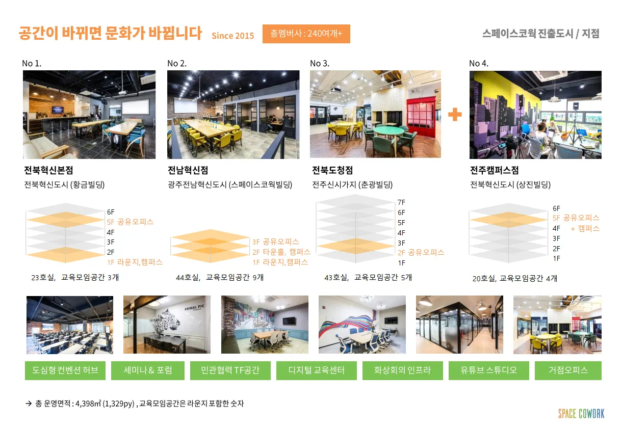 이종찬 대표는 1군 건설사의 신규사업팀 PM, 계열사 신규사업팀장을 거치며 다양한 대규모 프로젝트에 참여하였습니다. 건설사에서 아파트 개발사업, 지식산업센터 개발사업 등의 업무를 담당하고, 부동산 공간기반 신규사업 리서치 등을 통해 새로 만들어지는 공간의 유형들을 탐구해왔습니다. 이러한 경험을 살려 공유경제 기반 오피스 <스페이스코웍> 을 창업하였고, 창업초기부터 다목적 공유오피스 컨셉을 도입해 비즈니스 확장을 이끌어 왔습니다. 진화된 오피스 모델에 회의, 세미나, 모임, 교육공간을 결합하고, 진출지역과 협업하는 다양한 커뮤니티 프로그램도 운영했습니다. 새로운 형태의 코워킹스페이스를 기획하고 실행해 본 경험을 바탕으로 공간사업에 대한 인사이트를 나누고자 합니다.