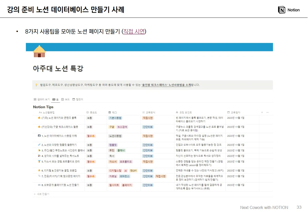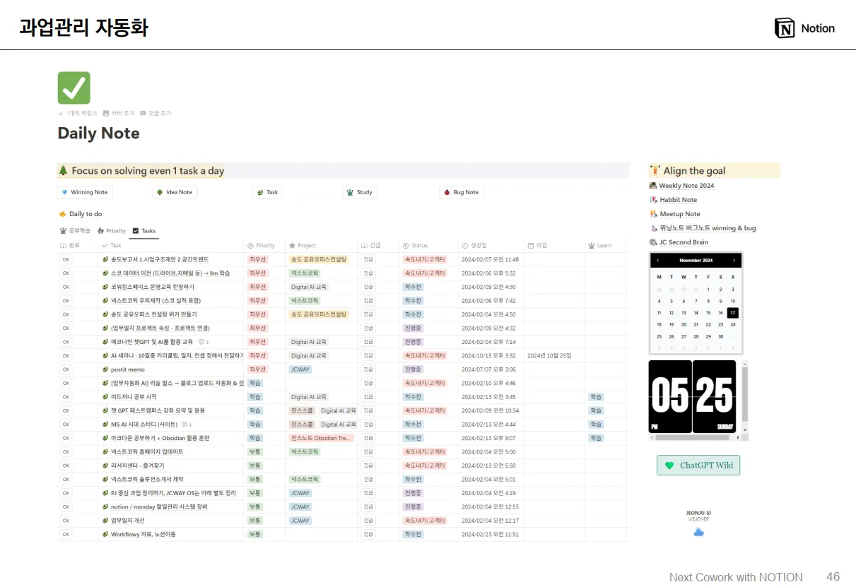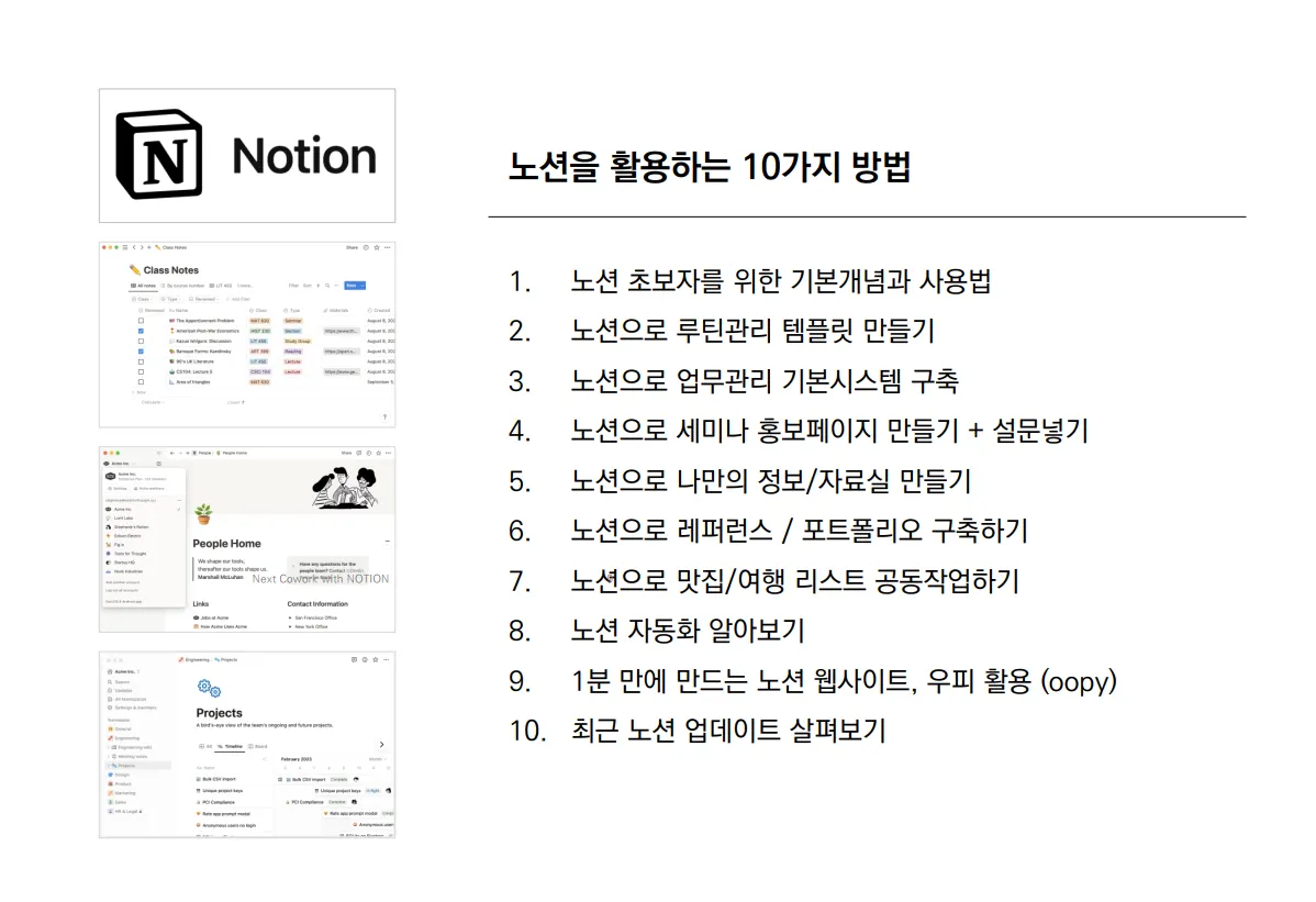 노션은 이제 단순한 메모 도구가 아닌 종합 업무 플랫폼으로 진화했습니다. 전세계적으로 사랑받는 올인원( All-in-one)워크툴입니다. 본 강의는 노션을 활용하여 기획, 리서치, 프로젝트 관리, 메모, 워크플로우를 하나로 통합하는 방법을 체계적으로 알려드립니다. 노션을 처음 접하는 초보자부터 활용도를 더욱 높이고 싶은 숙련자까지 맞춤형으로 강의를 들을 수 있습니다. 실무에서 즉시 활용 가능한 템플릿과 함께, 업무 효율을 극대화할 수 있는 노하우를 전수합니다.