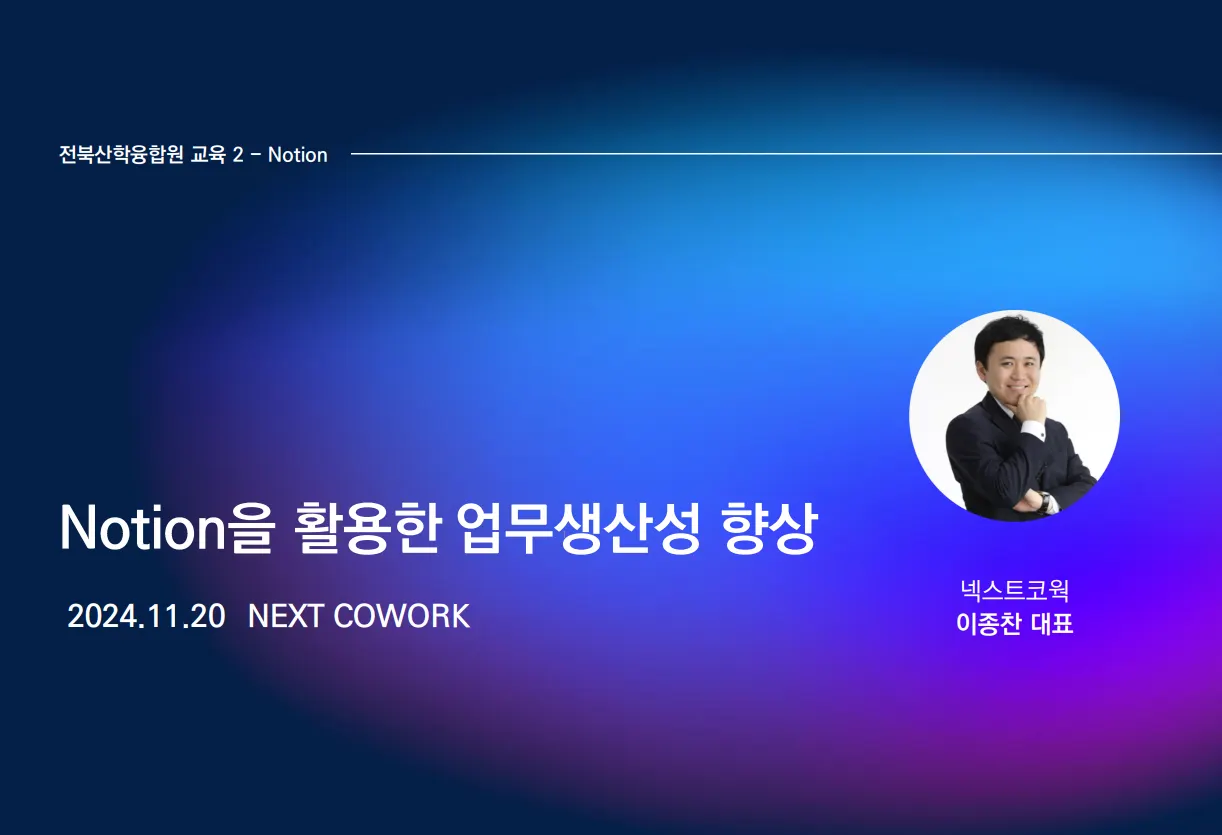 이종찬 대표는 1군 건설사의 신규사업팀 PM, 계열사 신규사업팀장을 거치며 다양한 대규모 프로젝트에 참여하였습니다. 직장생활 초기부터 스마트워크를 통해 업무생산성을 높이는 방법을 연구하며, 효율적이고 디지털친화적으로 일하는 방식을 탐구해왔습니다. 이러한 경험을 살려 공유오피스 <스페이스코웍> 을 창업하였고, 창업초기부터 디지털 클라우드 시스템을 도입해 비즈니스 확장을 이끌어 왔습니다. 사업기획과 리서치 과정에서 디지털메모와 노션 등을 적극 활용하며, 이를 통해 얻은 생산성 향상과 아이디어 정리 비결을 많은 이들과 공유하고자 노력했습니다. 세미나, 강의, 코칭, CEO 경영자문 등을 통해 ‘일이 잘되는 방법’을 전파하고 있습니다.