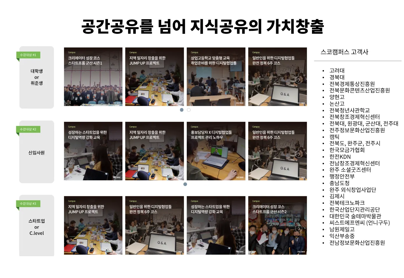 고려대, 아주대, 경북대, 전북대, 전주대, 전북경제통상진흥원, 창조경제혁신센터, 전북산학융합원, 지자체, 다양한 기업체, CEO자문코칭 등
